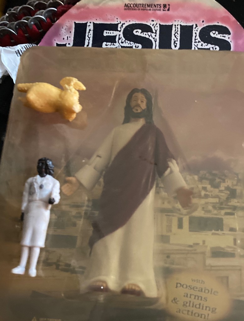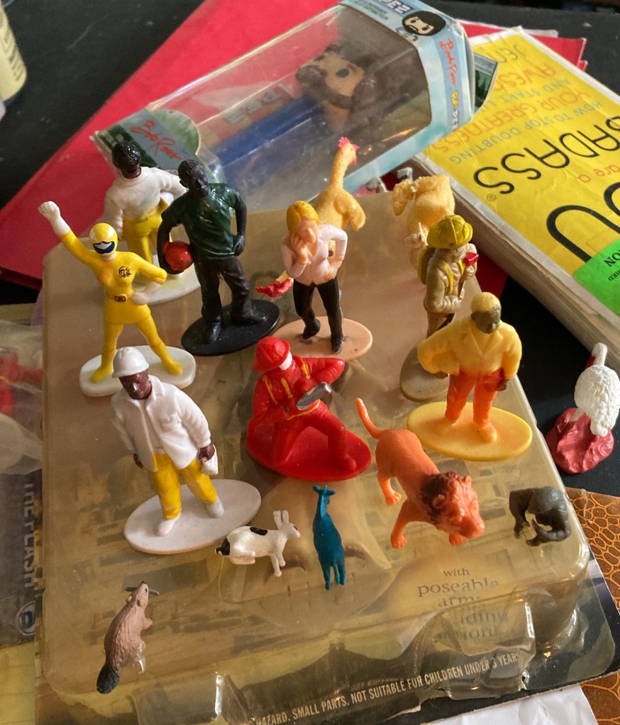 I collect these little “figures” from Archie McPhee. They have tons of them and they get changed out all the time. They had one series that was called “MULTICULTURAL FAMILY”, Women looking very assertive. Men with aprons on. Black men. It’s funny, I didn’t see a white one.
