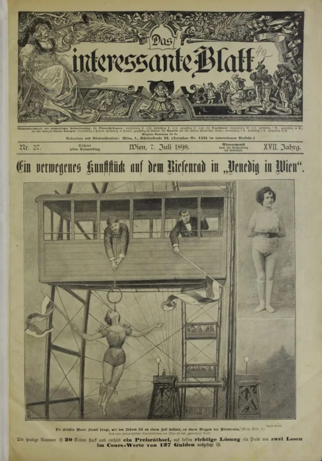 Marie Kindle hangs on a rope with her teeth from the Riesenrad Ferris Wheel to hopefully draw attention to the poverty that was around them. Pretty cool.