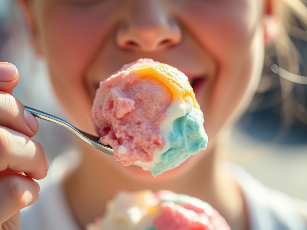 Ice cream is a frozen treat made from sweetened cream or milk, often flavored with vanilla, cocoa, or fruit like strawberries and peaches. The mixture is cooled below freezing and stirred to add air and stop ice crystals from forming. https://en.wikipedia.org/wiki/Ice_cream